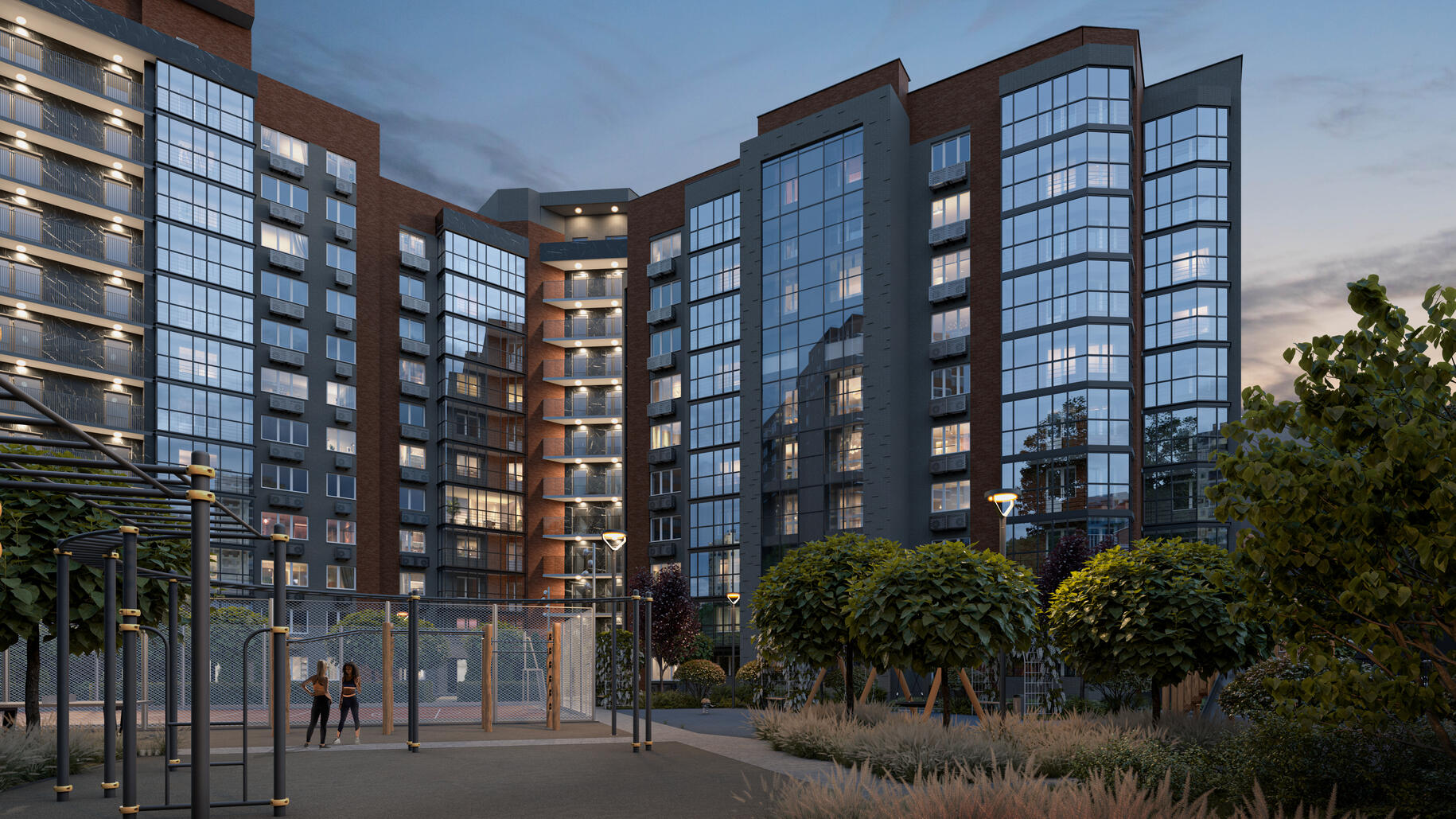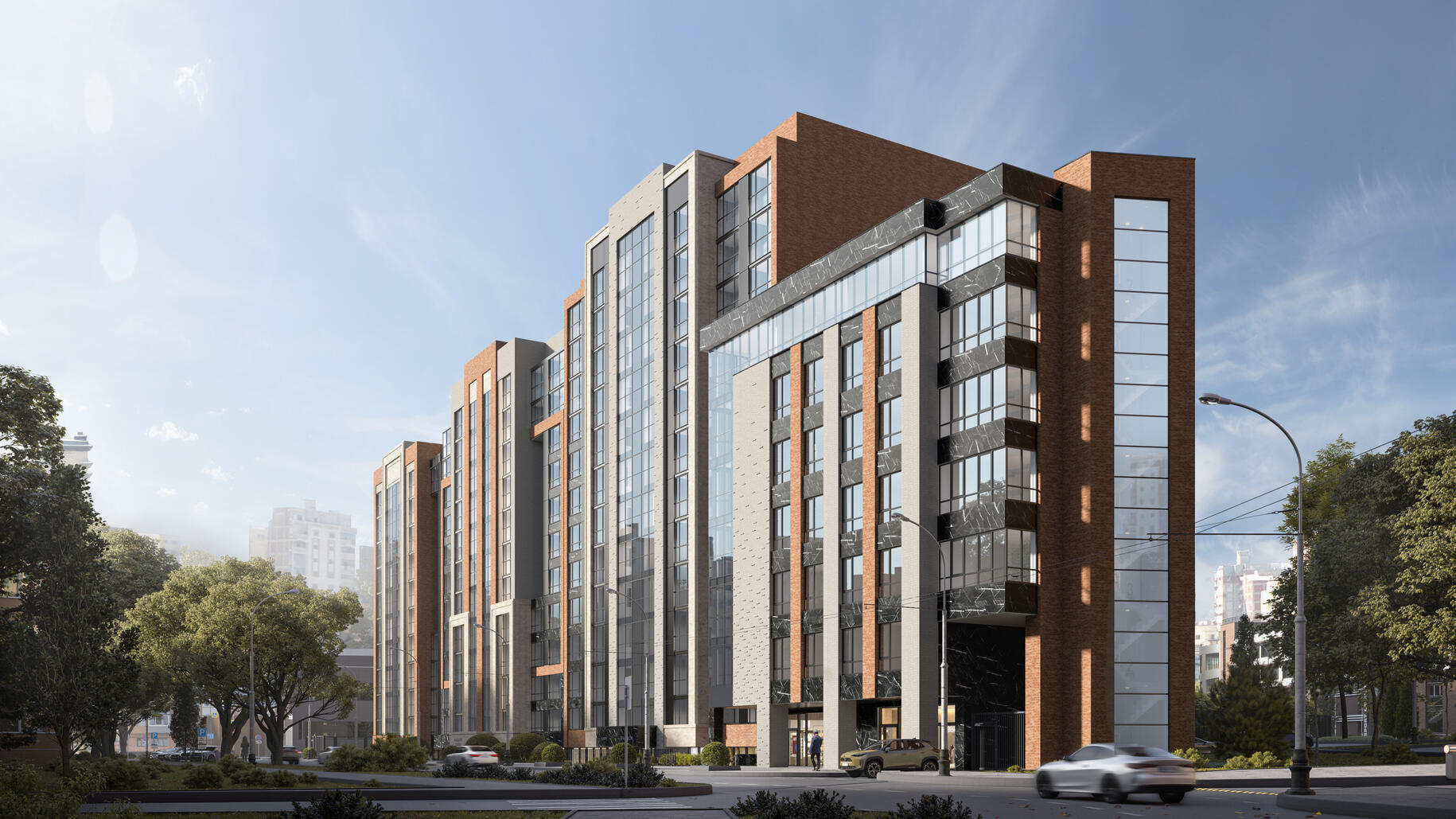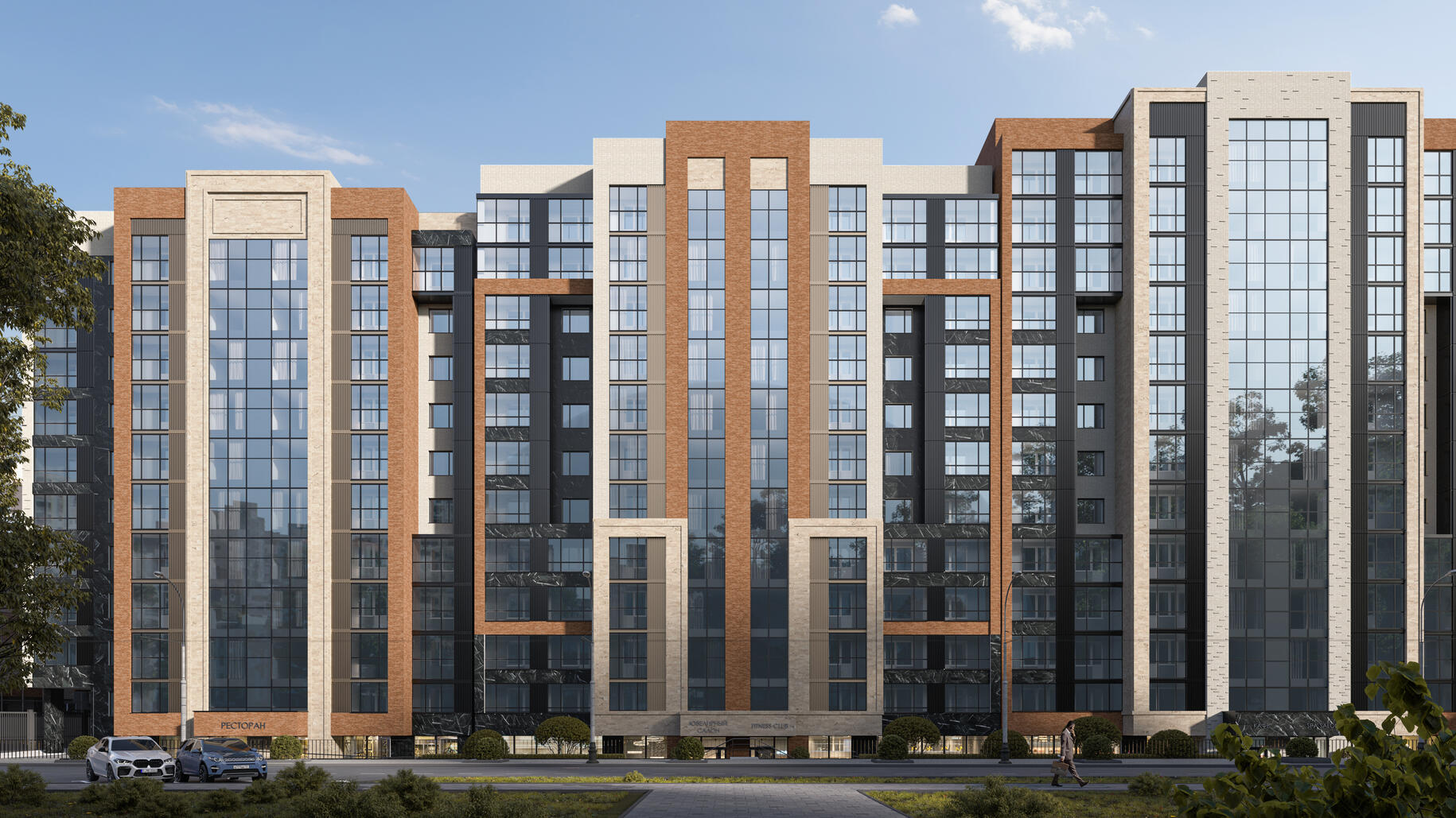 Элегантная архитектура клубного квартала сочетает в себе скандинавский минимализм и эко-тренды. Всего возводится 7 домов с переменной этажностью, вентфасады которых выполнены в насыщенных оттенках серого, терракотового и синего цвета.