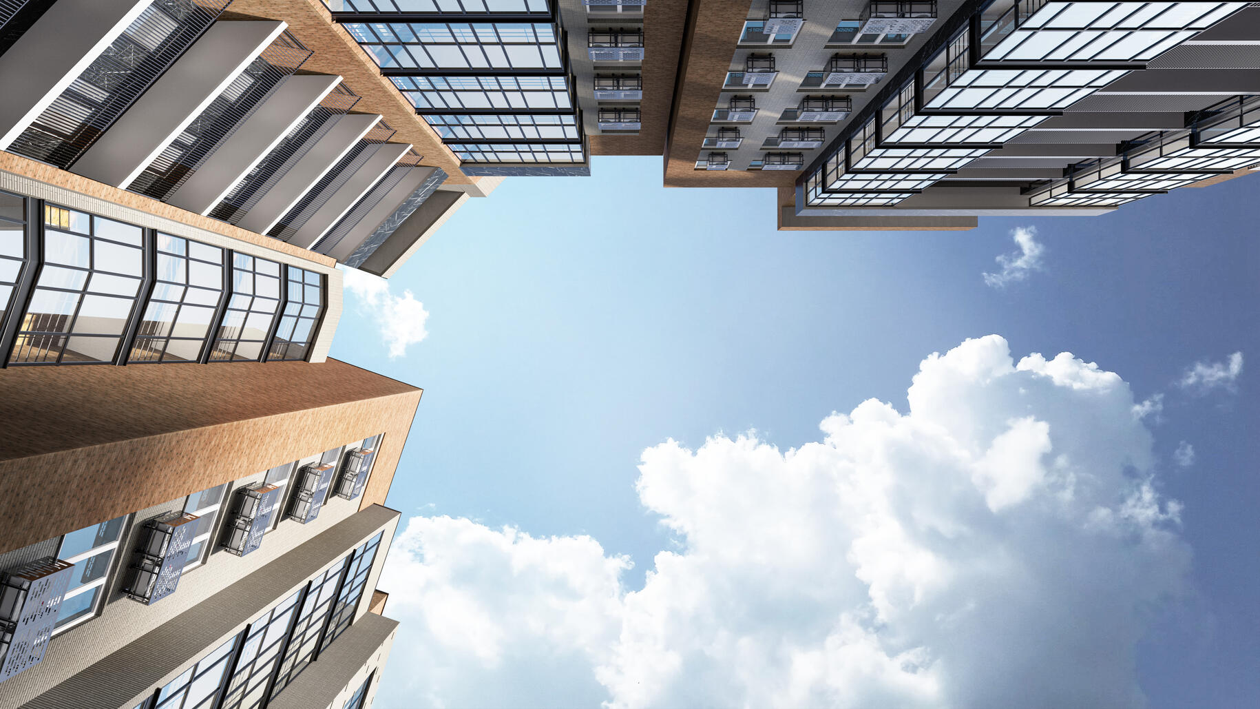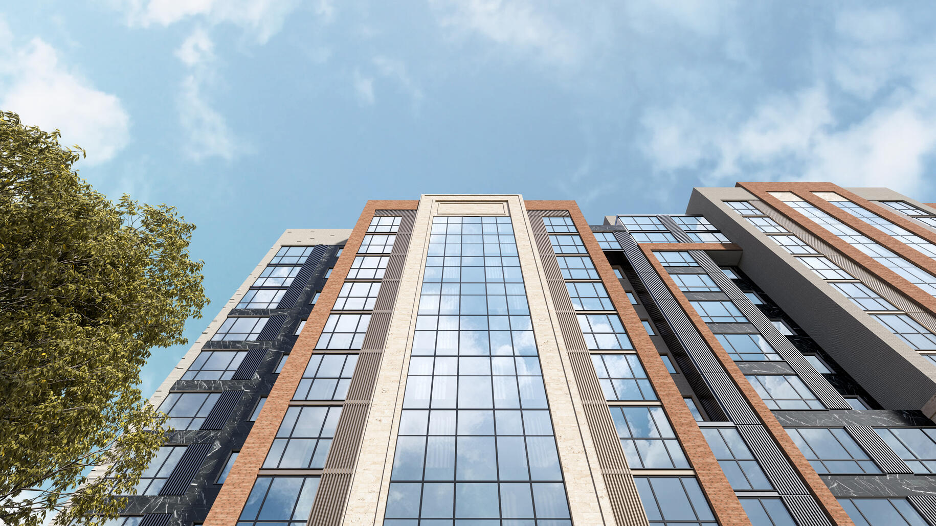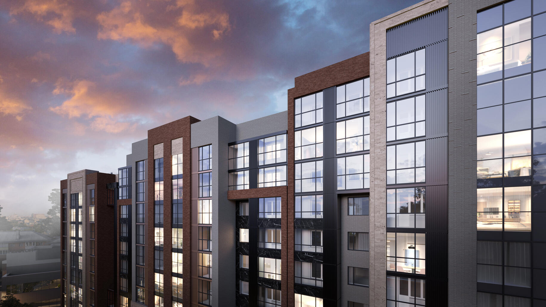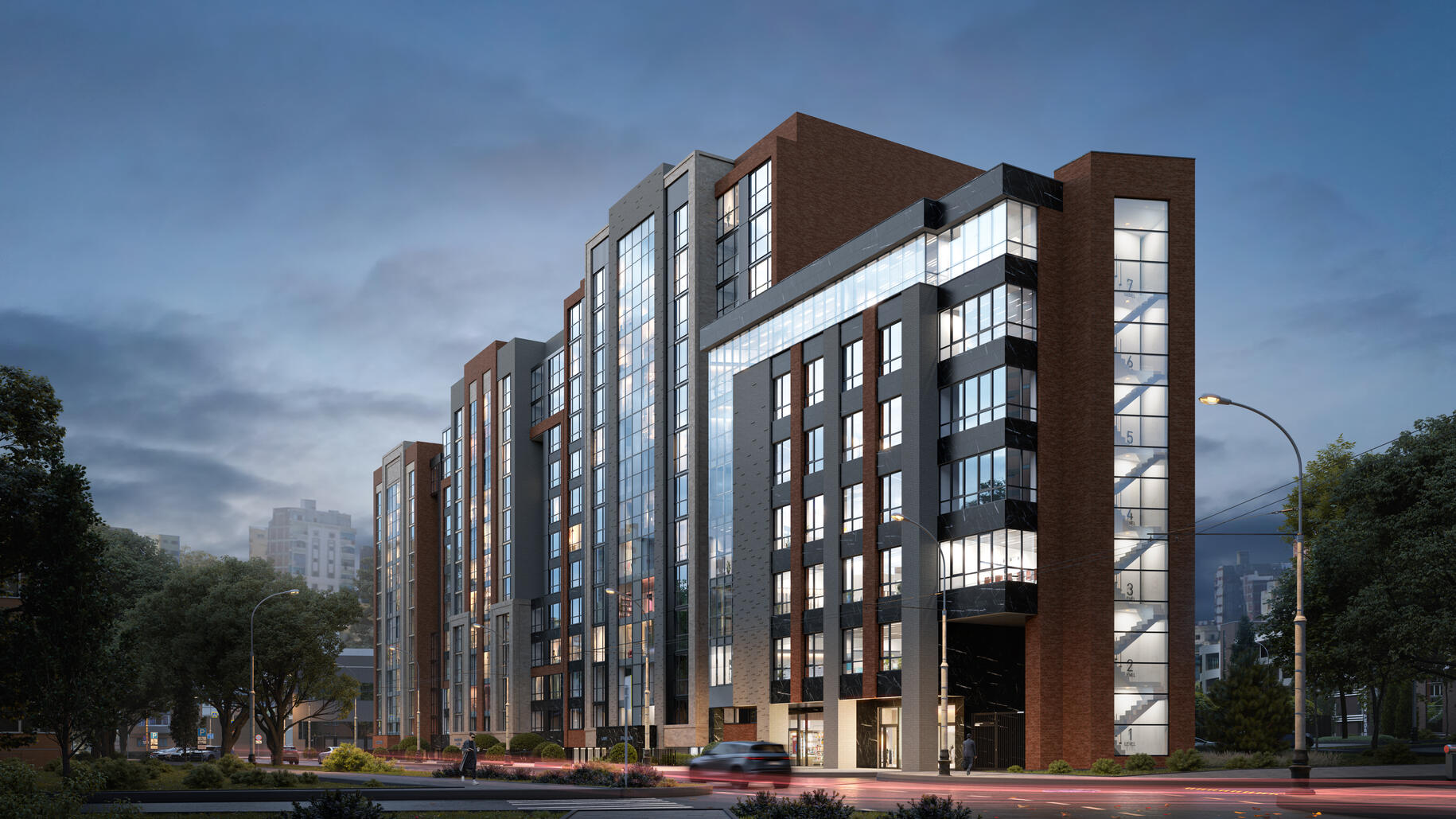 Элегантная архитектура клубного квартала сочетает в себе скандинавский минимализм и эко-тренды. Всего возводится 7 домов с переменной этажностью, вентфасады которых выполнены в насыщенных оттенках серого, терракотового и синего цвета.