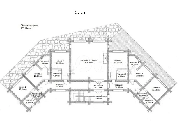 2 этаж: 7 номеров, каждый со своим санузлом, Общая зона отдыха с камином.