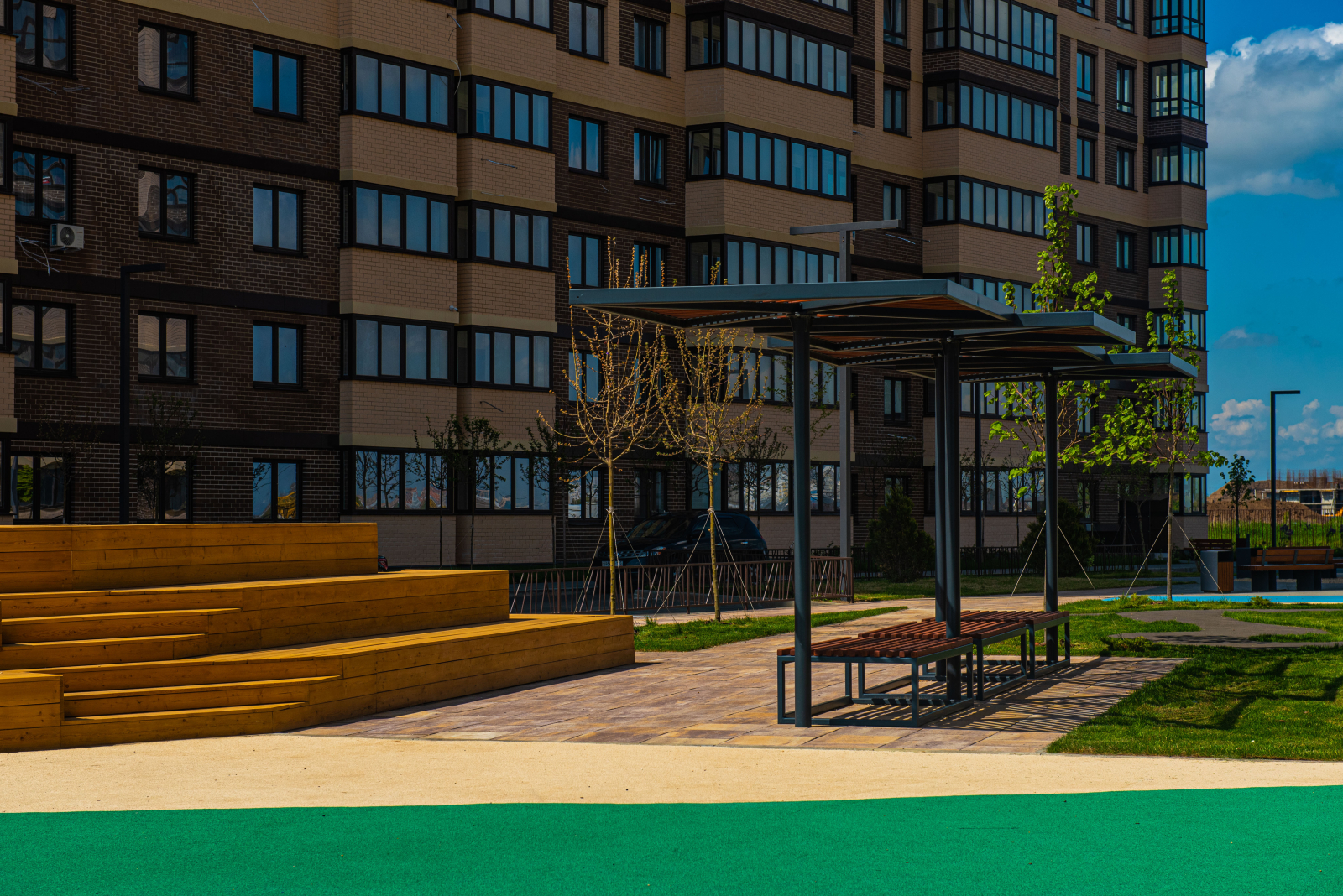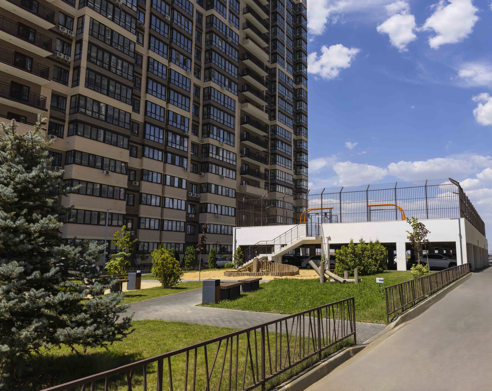 Комплекс обладает уникальной концепцией двор-парка «Страна чудес», где созданы условия для активной жизни, отдыха и семейной гармонии. Пространство включает разнообразные тематические зоны: площадь звуков и театр теней, многофункциональные спортивные площадки для футбола, баскетбола, йоги и аэробики, живописные беседки и уголки для релаксации.